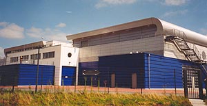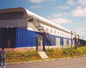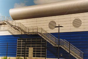Im unteren Fassadenbereich wurde ein horizontal gespanntes Aluminium-Stehfalzprofil über eine Zwischenkonstruktion auf Stahlkassetten montiert. Bereits bei der Planung wurden die Bohrungen für die Klippbefestigung vorgesehen, so dass die Klipps in der Werkstatt montiert werden konnten. Es entfiel daher das Einmessen der einzelnen Klippreihen.